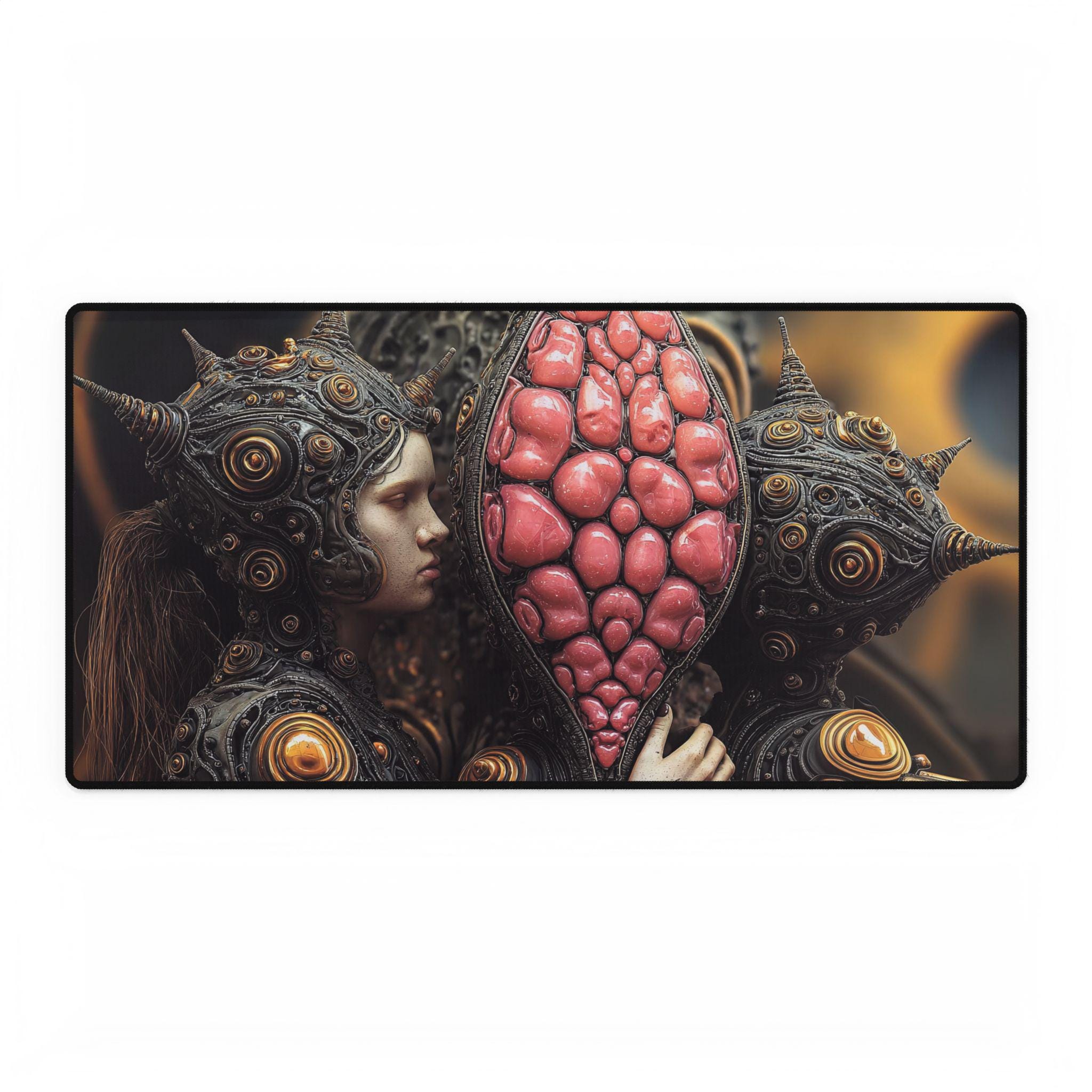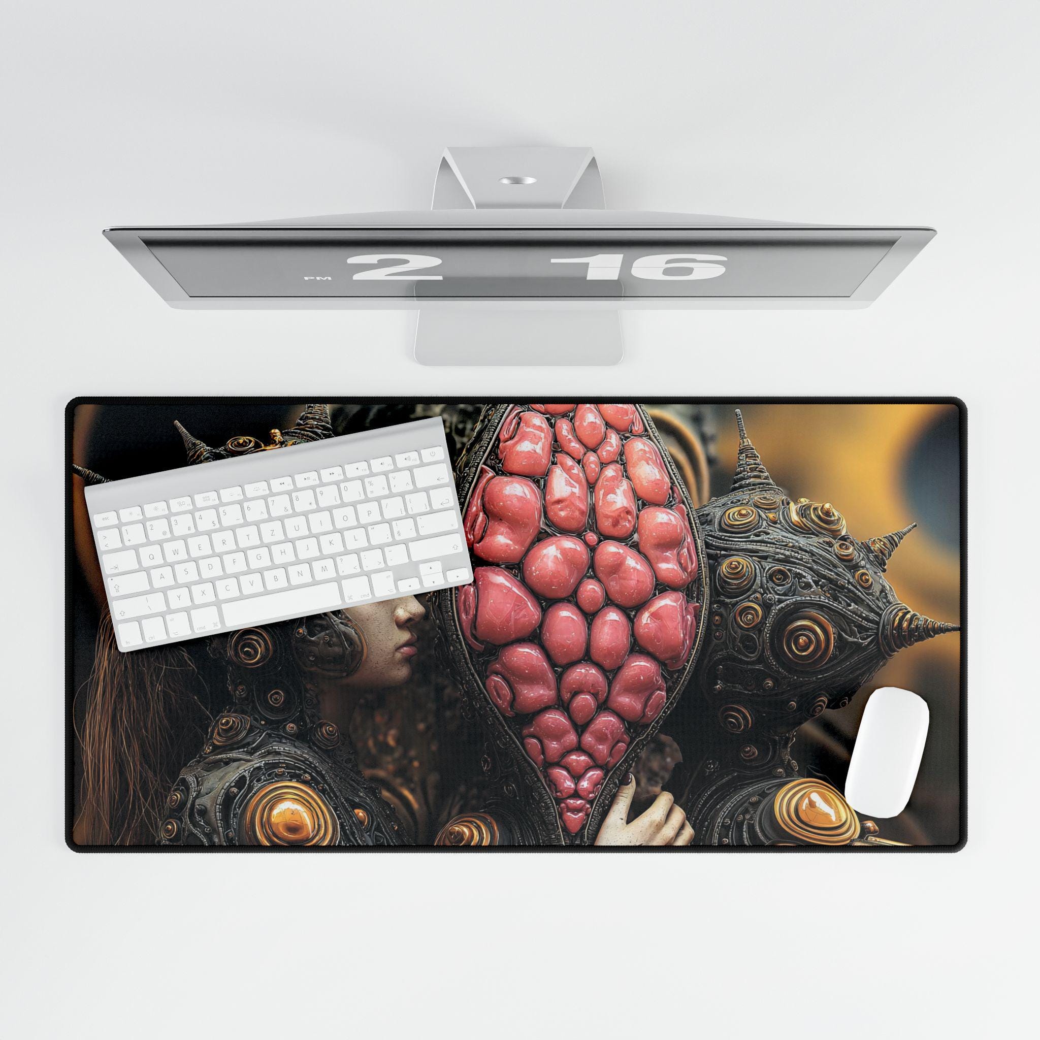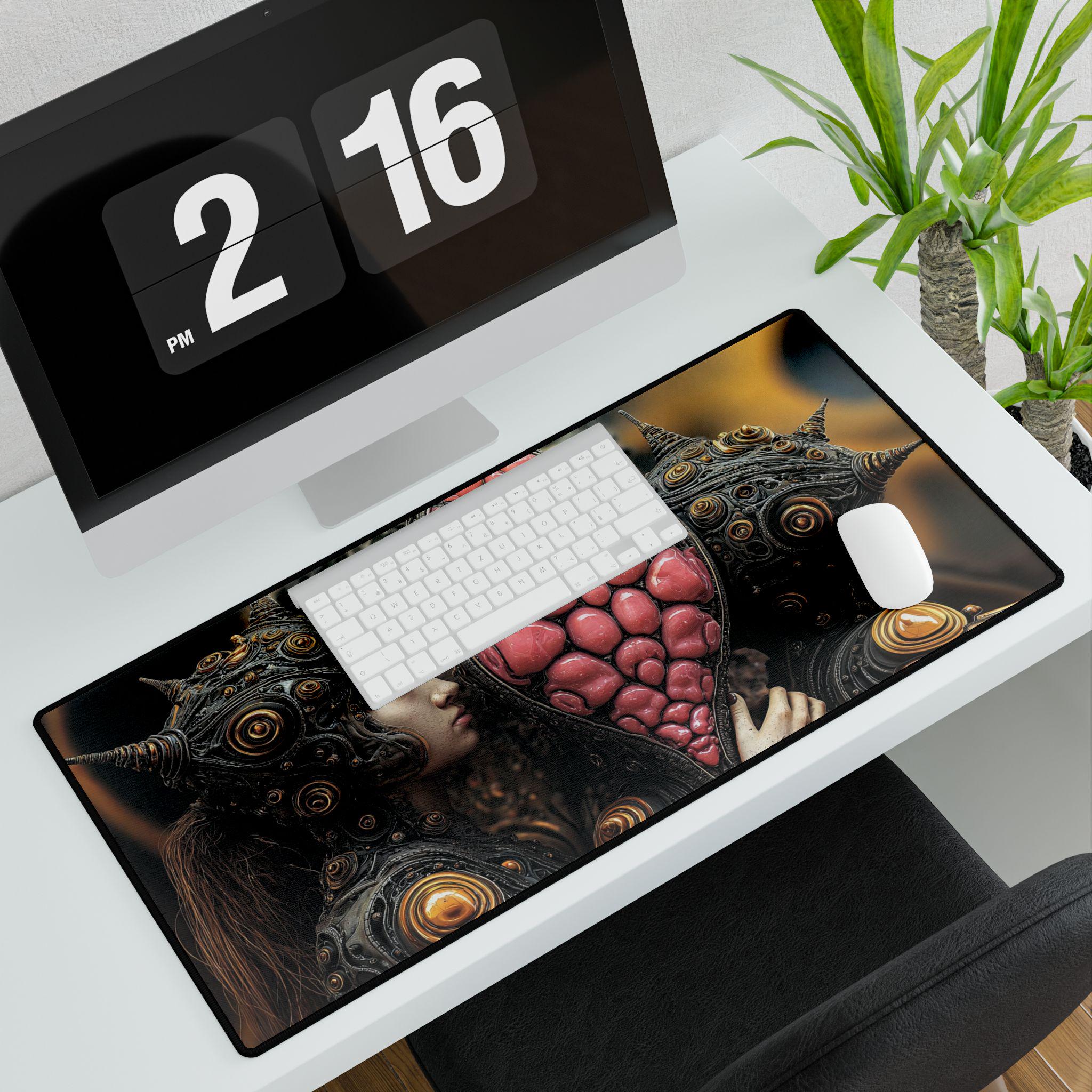 A large, art-forward desk mat that turns your workspace into a dark, surreal stage. The richly detailed artwork—an uncanny fusion of organic and mechanical forms—flows edge to edge in vivid, high-contrast color. The polyester top keeps mouse movement fluid and consistent, while the natural rubber underside locks the mat in place through long editing sessions or intense gaming. Stitched edges prevent fraying, and the available sizes let you cover just a keyboard or create a sweeping surface for keyboard, mouse, and sketchbook. This mat brings atmosphere and focus to desks where creative work, late-night streaming, or immersive play happens.